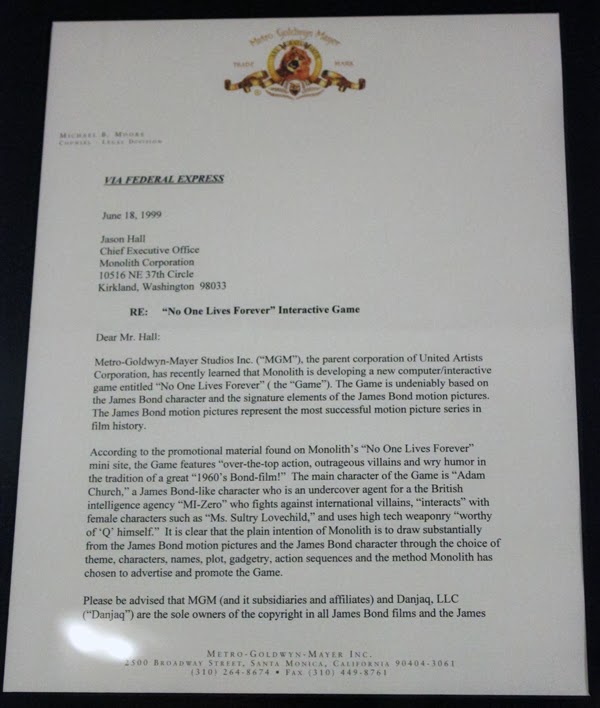 Les jeux No One Lives Forever : en 1998, Monolith Productions commence a travaillé sur un jeu d’espionnage se déroulant dans les années ’60 et inspirés de films comme Notre homme Flint ou de séries comme Chapeau melon et bottes de cuir. À ce stade le héros est nommé Adam Church, un agent secret britannique travaillant pour le « MI0 » qui a pour mission d’aider un biophysicien allemand à passer à l’ouest ; toutefois le transfuge est enlevé par un groupe terroriste du nom de H.A.R.M. Le joueur sera capable d’utiliser plusieurs gadgets au cours de l’aventure. Mais lorsque le FPS est présenté à l’E3 de 1999, il est immédiatement comparé à Goldeneye 007, d’autant plus que le titre est assez proche d’un roman de John Gardner (Nobody Lives for Ever). Sauf que les développeurs ne voulaient pas imiter Bond et pour éviter la comparaison, le personnage principal devient une femme : Cate Archer. Le ton change aussi, ce sera toujours un jeu espionnage dans les années ’60, mais sous forme de parodie à la Austin Powers avec H.A.R.M. comme une caricature du S.P.E.C.T.R.E. Un changement d’autant plus nécessaire que MGM avait menacé Monolith d’un procès pour les similarité du jeu avec Bond.