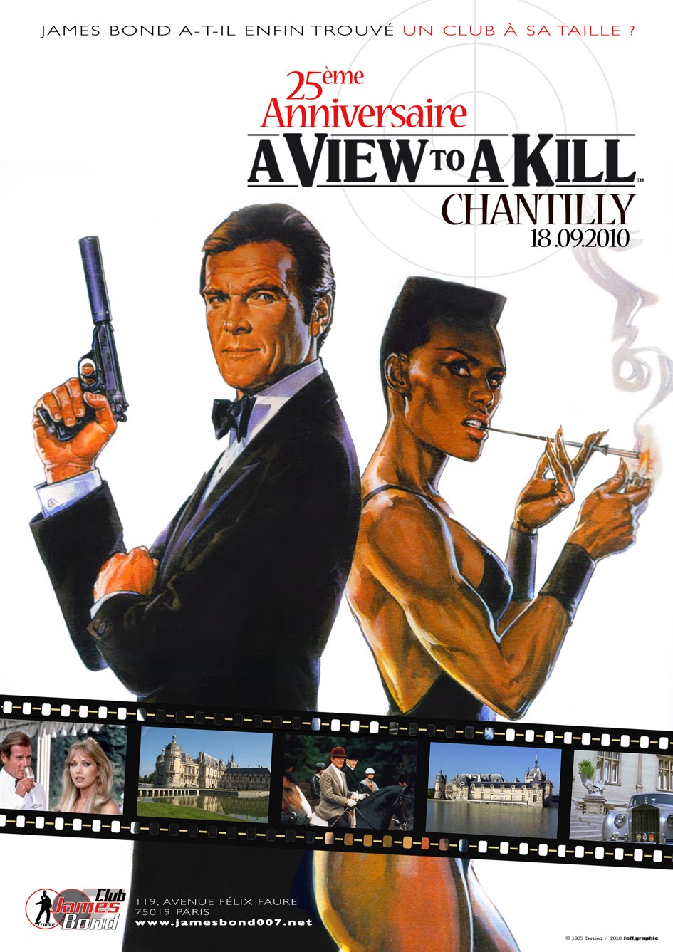 En 1985, Albert R. Broccoli et Eon Productions tournaient A View To A Kill (Dangereusement Vôtre), en France, à Paris et à Chantilly (Oise) autour d’un casting réunissant Roger Moore, Christopher Walken, Tanya Roberts, Grace Jones et Patrick MacNee. Afin de commémorer ce moment, à l’initiative du Club, la Ville, l’Office de Tourisme, le Domaine de Chantilly et « American Friends of Chantilly » ont décidé d’organiser un anniversaire mémorable.