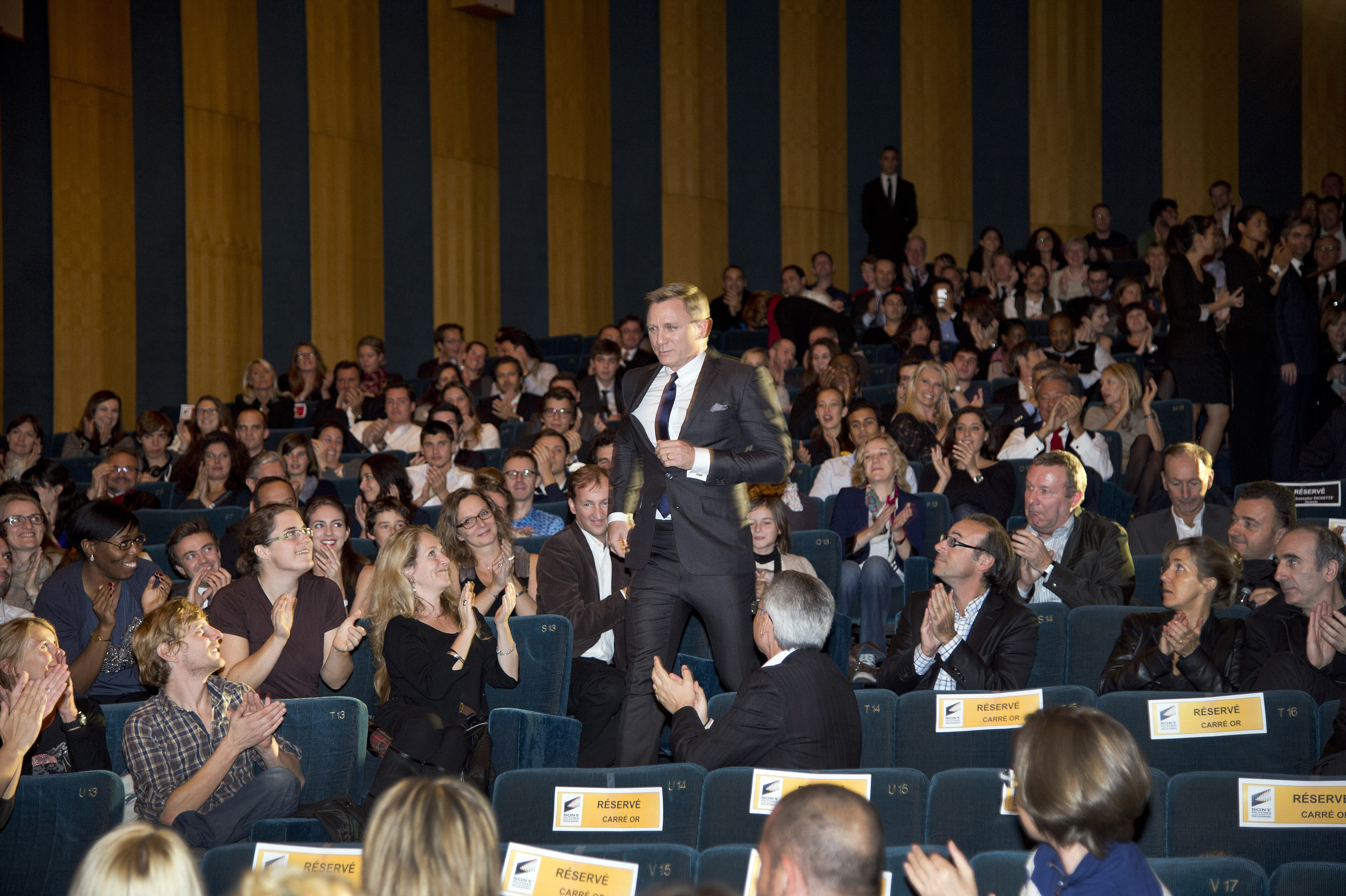 Déjà le public est sagement assis à l’intérieur dans deux salles distinctes, succès oblige. Dans la salle numéro 2 spécialement « affrétée » pour le Club, l’excitation est palpable. Puis la pénombre, le silence. En guise de préambule, quelques minutes d’un montage commémorant cinquante années de souvenirs gravés sur pellicule. Montage efficace et millimétré sur fond de mélodies bondiennes. Un pur bonheur. Un frisson parcourt l’assistance, il ne nous quittera plus. Le lion rugissant de la Métro, la torche incandescente de Miss Columbia, premiers indices du plaisir à venir. Voici le regard perçant de Daniel. C’est parti pour deux heures de grand et bon spectacle.