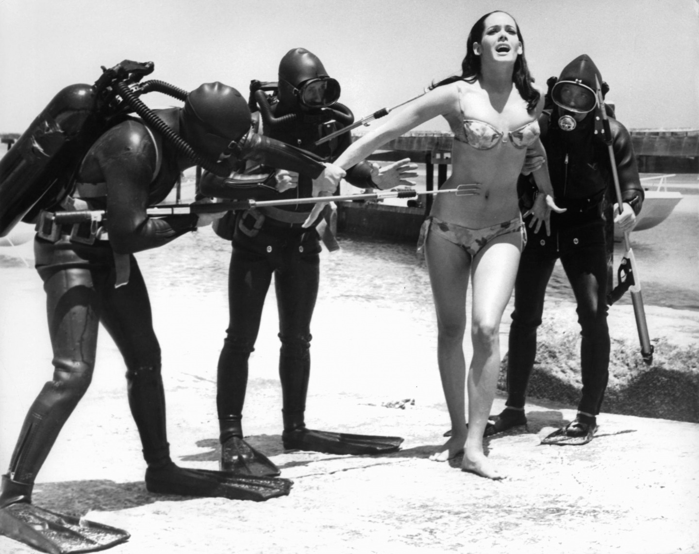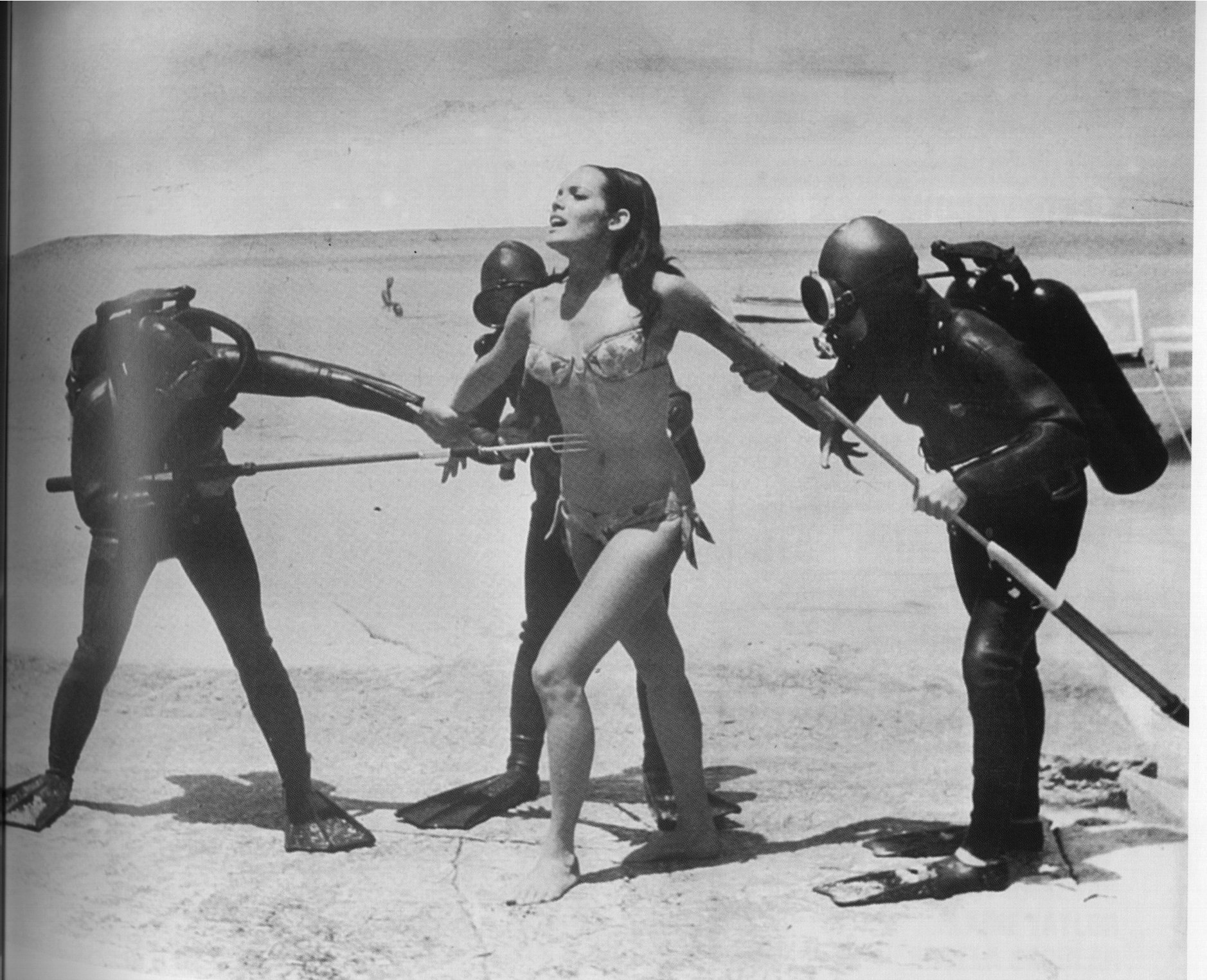 Il existe de nombreuses photos où l’on voit Paula faisant face à des hommes grenouilles sur la plage. Il ne s’agit pas d’une scène supprimée, mais d’un shooting photo réalisé pour Opération Tonnerre au moment du tournage.